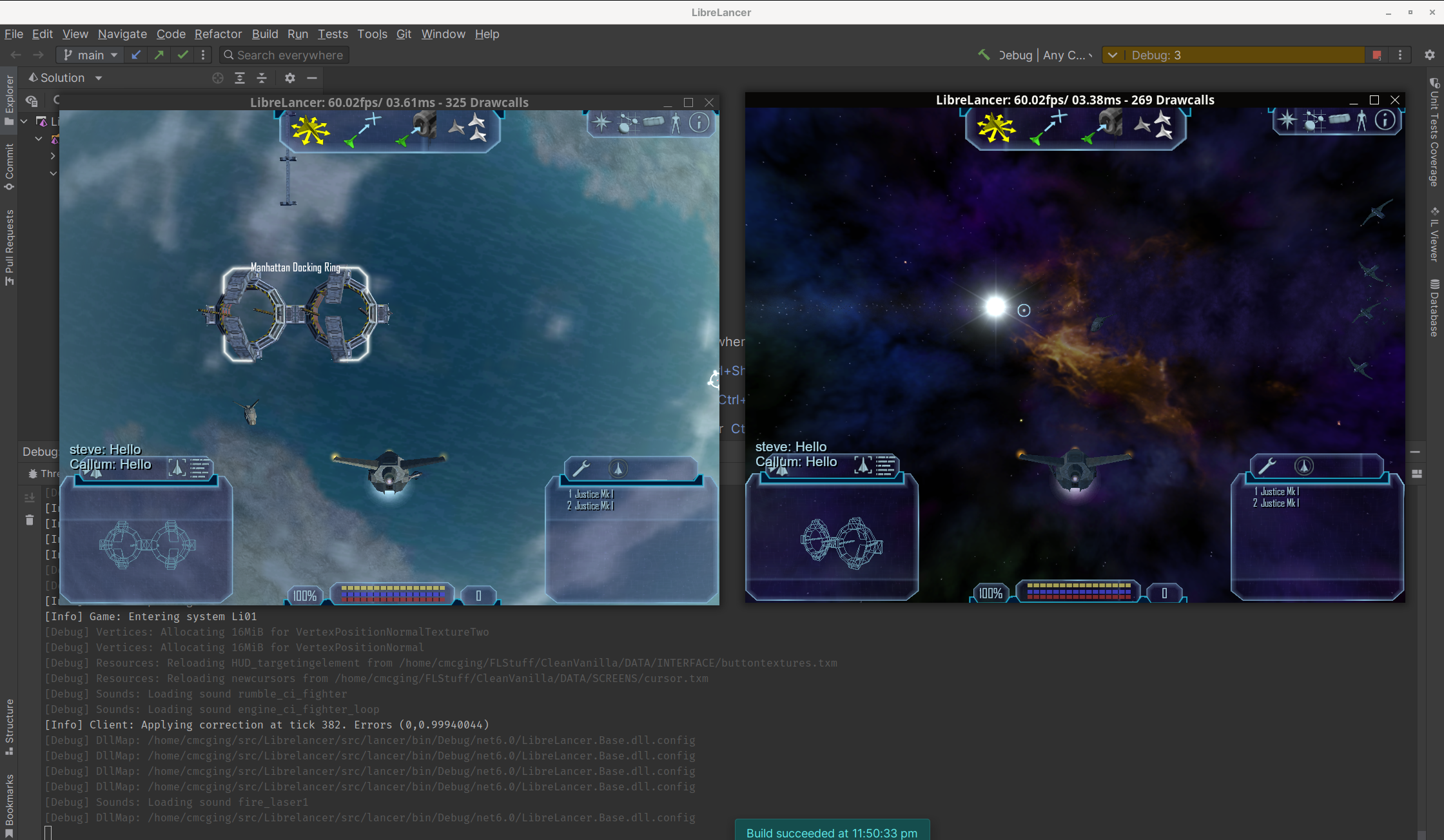 When Librelancer sends it’s input to the server, it assigns that collection of inputs a number representing the time it was taken. It then stores these inputs in a buffer big enough to hold the past few seconds. When the server sends the results back, enough time will have passed for the position sent back to be in the past, held somewhere in this buffer. When it’s determined the difference is too big, we set the player’s position to be the one the server has sent. We then go through the buffer, replaying all the inputs that we have captured in order to get a new simulated position that is more accurate to what the server will see in a few ticks time. We also set the NPCs and other players’ positions at the same time, so the local player will see them a little bit in the past. As we are running a full simulation on the client however, it’s important to start from a state with everything set up so we can attempt to simulate collisions. When one of these resimulations happen, you can find a line like this in the Librelancer log: